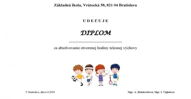 Názornú ukážku im predviedli žiaci I. B a IV. B triedy. Na záver každý žiak aj predškolák dostal DIPLOM za absolvovanie otvorenej hodiny telesnej výchovy.